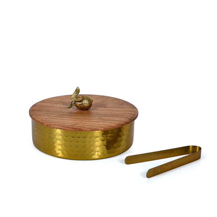 Bring home timeless elegance with Elan’s Dabbahs & Days Roti Box with Chimta – a perfect blend of tradition and modern artistry. Handcrafted in hammered stainless steel with a radiant gold finish, it reflects India’s rich heritage in every detail. The smooth acacia wood lid topped with a handcrafted aluminium lemon knob adds a natural warmth and an artisanal charm.Complete with a matching gold chimta, this piece is as practical as it is beautiful — ideal for serving rotis, snacks, or festive treats. A perfect gift or a stylish addition to your tableware collection, this Elan creation brings luxury, functionality, and craftsmanship together in one elegant form.