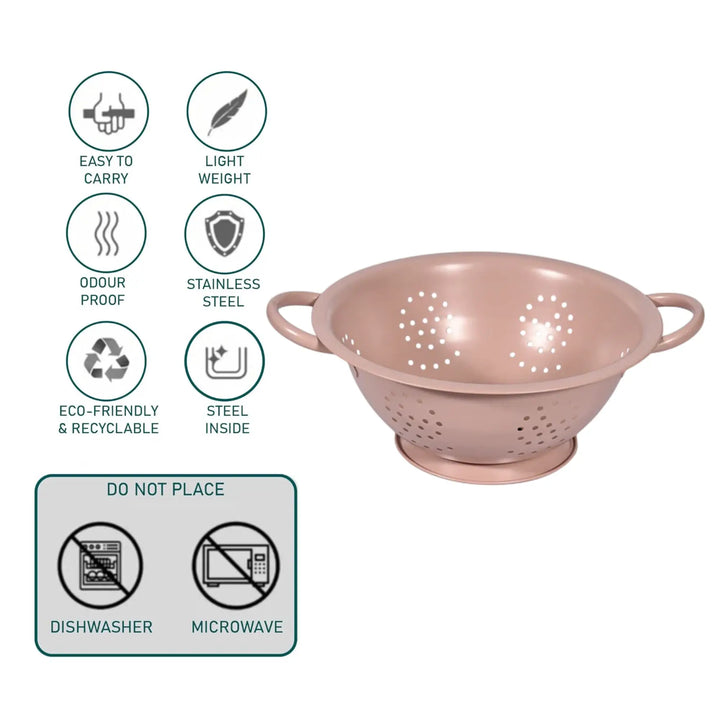 Bring modern elegance and functionality to your kitchen with the Elan Stainless Steel Colander. Thoughtfully designed for everyday use, this premium colander is crafted from durable stainless steel and finished with a powder-coated matte layer, offering both style and strength.Its uniform perforations allow for efficient drainage, while the sturdy dual handles and stable base ring ensure comfort and convenience during use. Perfect for washing fruits, vegetables, or draining pasta, this versatile kitchen essential doubles as a stylish serving piece.With its minimalist form and durable build, Elan’s colander seamlessly blends practicality with aesthetic appeal — making it a must-have for every modern kitchen.