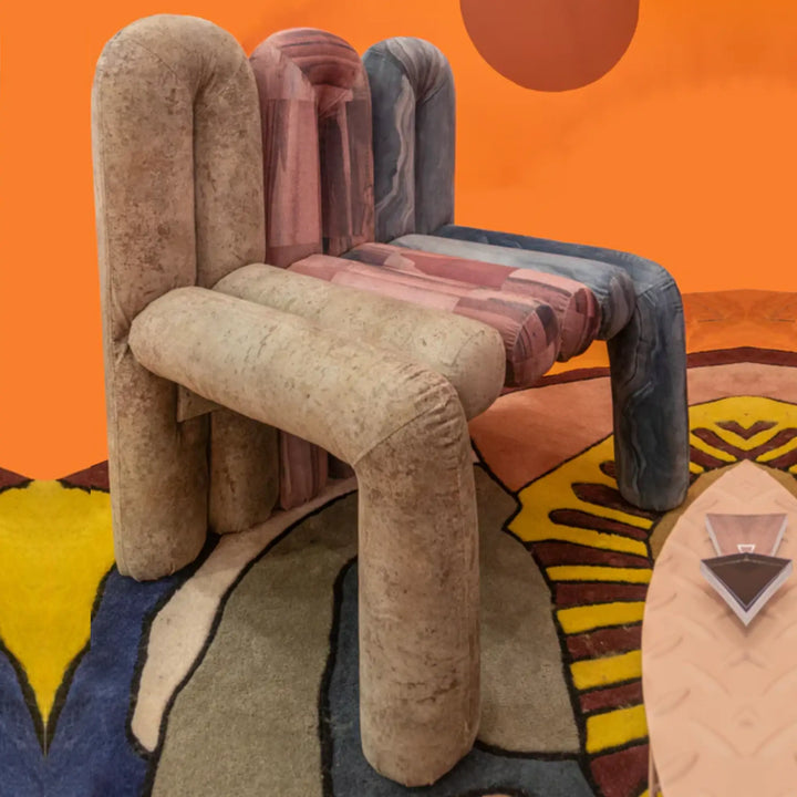 The Three to Tango chair is upholstered in soft heavenly shades of oatmeal, burgundy and azure. Fabric can be customized.